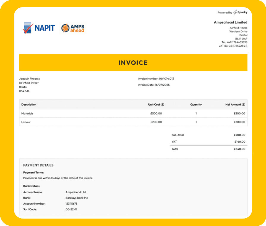 Sparky also produces a comprehensive report detailing the calculations for each circuit and which tables were used, so that you can be confident everything is in compliance with the regulations.